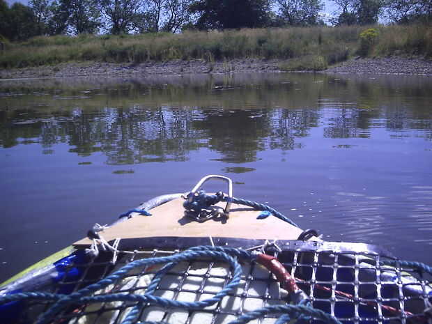 20 libras y el carro está hecho de madera ligera y plástica cuando puse el bote en el agua solo atar el carro a la popa y remolcar detrás de mí. El bote parece absolutamente uniformemente equilibrado y se sienta bien en el agua y atrae a unos 7-8 pulgadas y tengo una paleta de la canoa de aluminio que usar para propulsar a mí mismo. Fotos tomadas con cámara Vivitar Vivicam 3188.