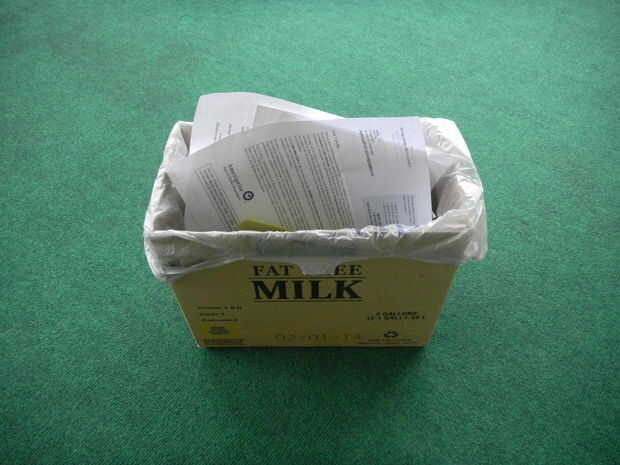 Compramos leche cada semana. La tienda de almacén venta doble de un galón de leche en una caja. Encontré esta caja de leche se puede hacer a una papelera de cartón y su tamaño sólo adaptarse a la mayoría de bolsas de plástico supermercado. Reutilizar ambos las leche caja y abarrotes bolsas de plástico que tenemos mucho de supermercados o tiendas de comestibles. Otro beneficio es que puede cambiar nuevo bote de basura cada semana y cuesta $0.