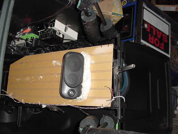 Montara un trozo viejo de paneles al frente de la Asamblea de aumento, y entonces había atornillado el altavoz individual a él. He añadido más espuma grandes cosas alrededor del altavoz para reducir la vibración bajo. Después de que la espuma seque rocía todo nuevo con pintura negra mate.
