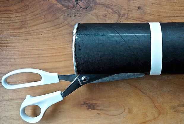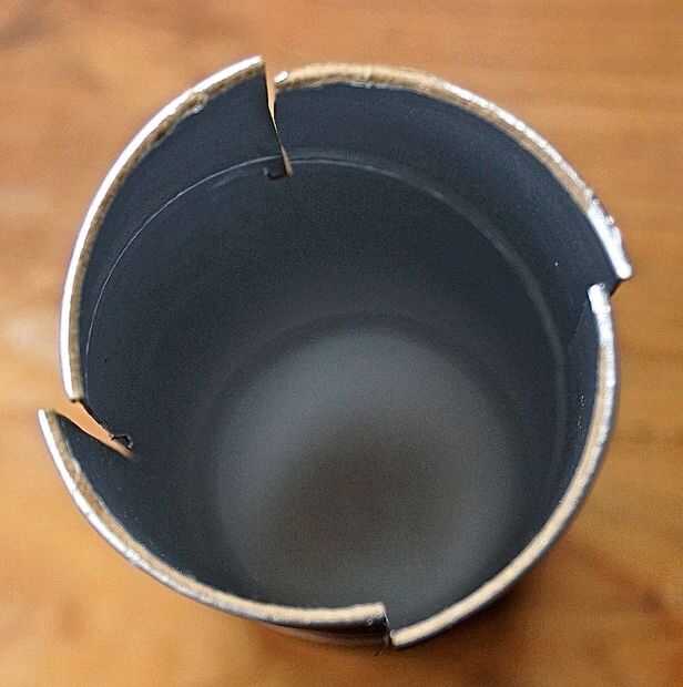 Luego hacer 4 marcas en el borde de la lata y cortar hacia abajo justo antes de la envoltura de la cinta blanca.