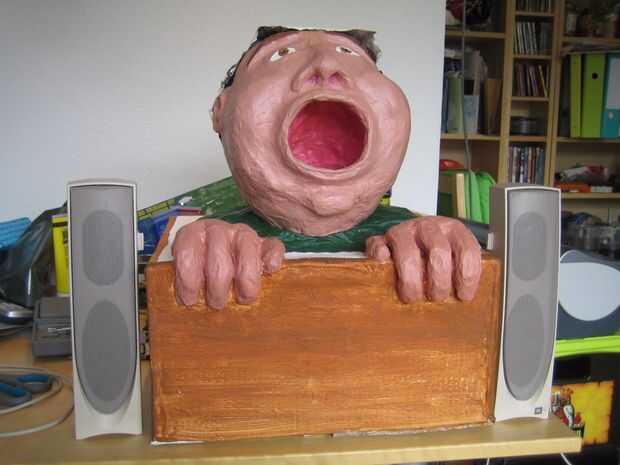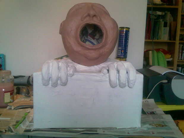 Ahora todo lo que necesitas hacer es implementar la tecnología en su papelera. Decidí hacer una cabeza con papel maché y la LDR en la boca con un led luminoso en la LDR. Así que estoy seguro la LDR solamente dejará de detectar luz si algo pasa a través de la boca y no se si alguien pone su mano delante de la boca.