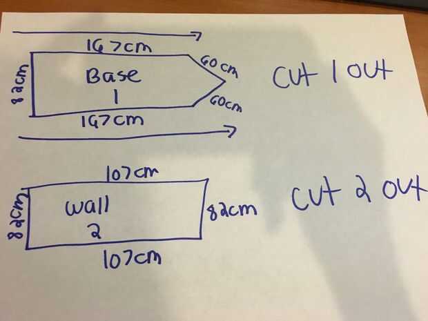 Primero Haz tus cortadores de cartón y la caja. Hemos hecho dos capas de cartón, pero podría hacer 1 o 3 Si desea. Estará cortando 6 piezas diferentes. Comienzo con la base de corte primero para que tengas algo para asegurarse de que sus medidas se alinean. La base tendrá una anchura de 82cm y una altura total de 167cm. El triángulo en la parte superior tiene una base de 82cm y la altura será de 60cm. Una vez que la base de ahora puede empezar con las paredes