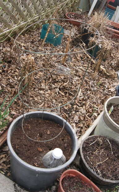 La olla recién llenada está situada en la esquina de mi jardín de verdes con la botella de agua de fácil acceso desde el patio vecino.