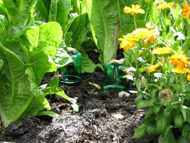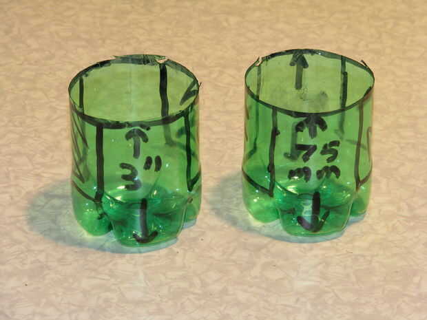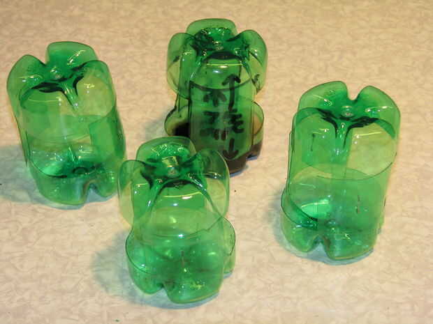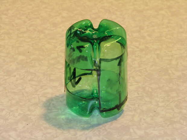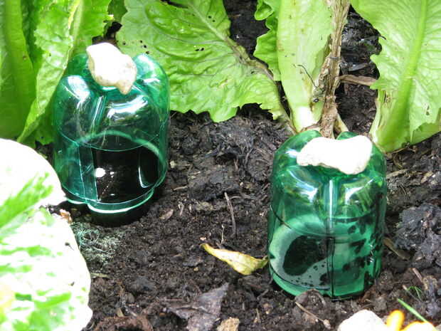 La primera de ellas fue hecha en el espacio de 5 minutos. He tenido las babosas comiendo mis plantas y un compañero de trabajo mencionado lo mismo igual que estaba vertiendo agua con gas de una botella. Fue uno de esos 'eureka' momentos. Varias de las botellas tenía en mi armario que 'llegaría en un día práctico' y que fue el día! 5 minutos más tarde utilizando sólo material de oficina que tenía la primera trampa para babosas construida.