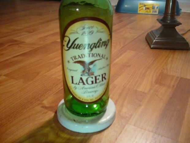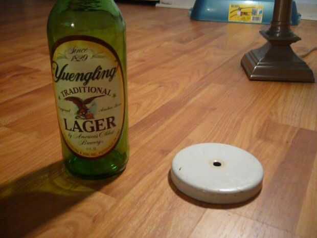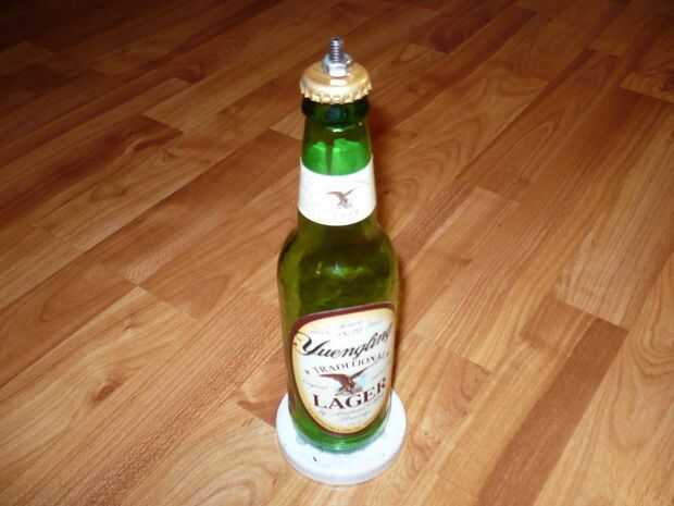 Limpiar ambas superficies y asegúrese de que estén secos. Con pistola de pegamento caliente, aplicar el pegamento en el borde inferior de la botella y en el centro. Mantenga un momento y deja que se enfríe y endurezca antes de mover.