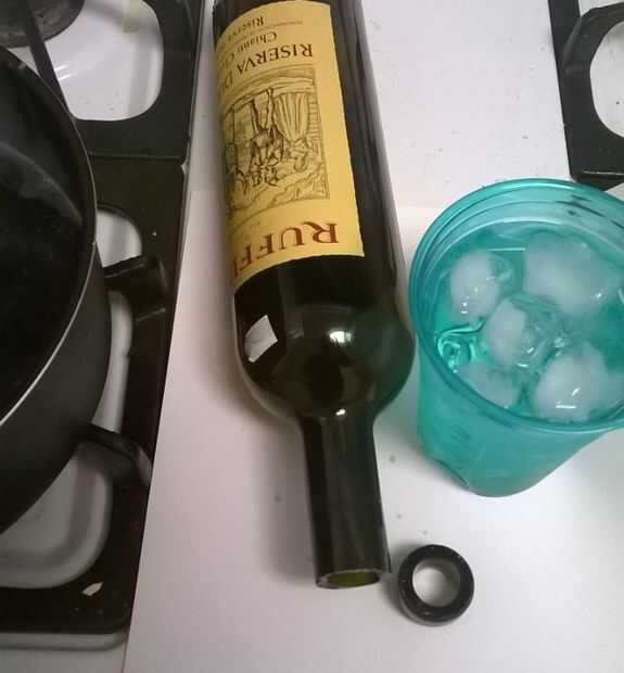 El vidrio es un material duro y fuerte (perfecto para una diapositiva). Pero puede ser debilitado y entonces aplicando un choque térmico, puede romper fácilmente. Ese es el truco aquí. Cortar la botella, luego sumergir el cuello en agua hirviendo durante unos minutos, y finalmente lo sumergen en agua helada. Tuvo dos intentos, pero luego hubo una satisfactoria "tink!" y al final del cuello cayó gratis, dejando un bonito corte liso. CUIDADO! Es un borde duro y fuerte! (más en eso más adelante).