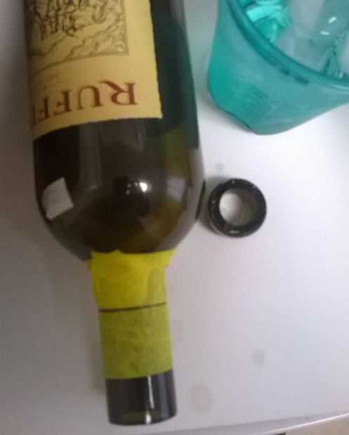 El segundo corte no permitió que a un buen guía recta para el cortador de vidrio. Para mantener el corte recto, envuelve el cuello de la botella con cinta de enmascarar. Luego sobre un milímetro de distancia, con otra vuelta de cinta adhesiva. Esto ayuda a guiar la mano y también protege el vidrio contra el rasguño en la botella donde no. Es posible que un corte errante podría causar la botella para romper en un ángulo extraño. Otra vez, corte alrededor del cuello con un corte. No pasar el corte varias veces. Si hay un rasguño visible, blanco y bonito alrededor de él, es suficiente. Luego retire la cinta y el agua hierve nuevamente.
