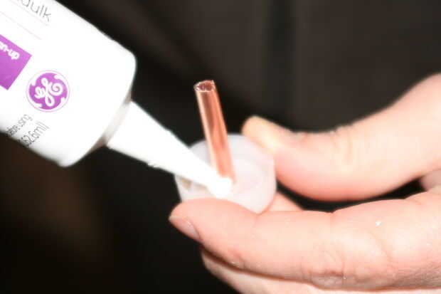 Tomar el sellador y a ambos lados de la tapa, coloque sellador alrededor de la tubería donde está en contacto con la tapa.