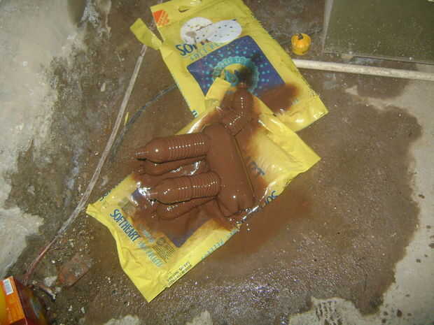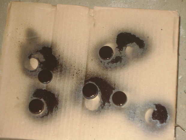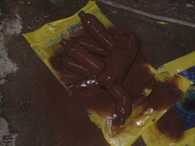 Retire los tapones de botella y apartarlas. Pintura de aerosol del cuerpo y la cabeza marrón. Pintura de aerosol los tapones de botellas negro (patas y boca). Una vez el cuerpo y la cabeza seca turun él encima y rocíe el otro lado.