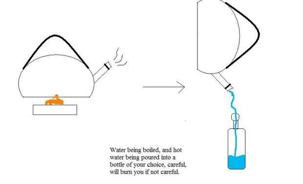 una vez que el agua este hirviendo, vierta en la botella, ten cuidado, que el agua está caliente, usar guantes para hacer esto.