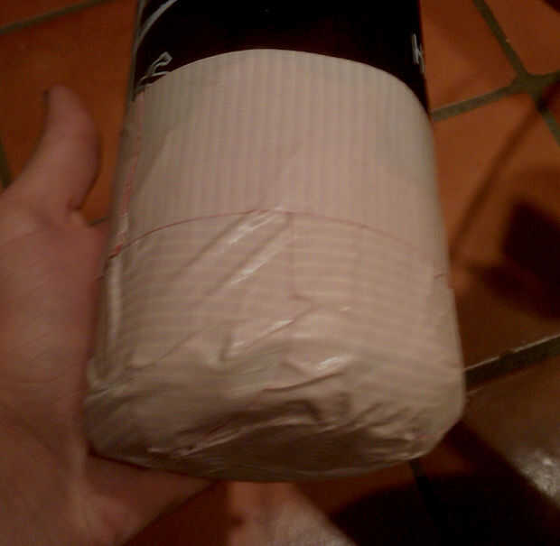Para este paso, tratará de cubrir completamente el fondo del frasco en forma similar al proceso por el cual se hizo el lazo alrededor de la botella. Usando longitudes de cinta lo suficiente para estirar de la parte superior de su ciclo, en la parte inferior de la botella de agua y luego para arriba verticalmente en el lado opuesto, comienzan a añadir las tiras en un patrón circular. Como el primer lazo hecho, las tiras deben tener su lado adhesivo hacia afuera, lejos de la superficie de la botella de agua. Esto involucra la ejecución de cada tira verticalmente hacia abajo desde la parte superior de su ciclo, donde se ha colocado alrededor del fondo del frasco y luego de vuelta hasta el otro lado, donde se une el otro extremo. Asegúrese de que a medida que agrega cada tira, superponen la tira anterior por lo menos 1/4 de la anchura de la tira. Esto garantizará máxima impermeabilización. Continuar en un círculo, tratando de espaciar uniformemente las tiras entre sí, hasta cubre completamente el fondo del frasco. (Ver imagen de aclaración) Añadir un lazo más similar al bucle en el paso 2 alrededor de la circunferencia de la botella en el nivel donde se unen los extremos de las longitudes. Esto es sólo una medida de protección para añadir fuerza a la parte inferior de la botella de agua (donde la mayoría de cualquier peso de agua se encuentra).