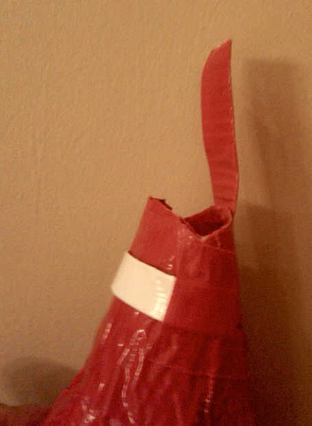 Para crear medios de sostener esta correa hacia abajo, cortar otro pedazo de cinta adhesiva de una cinta colores diferentes (blanco en la imagen) y doblar varias veces hasta que es demasiado áspero 1/2" ancho. Cinta en un ángulo perpendicular a la cinta roja (si fue doblado encima).