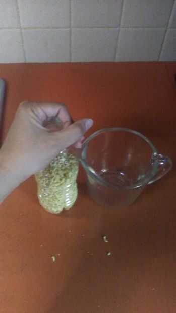 Envolver una mano alrededor de la parte superior de la botella de agua para actuar como una especie de embudo para ayudar a conseguir los fideos en como viertes de la taza de medición. Vierta lentamente para evitar derrames.