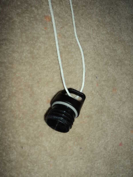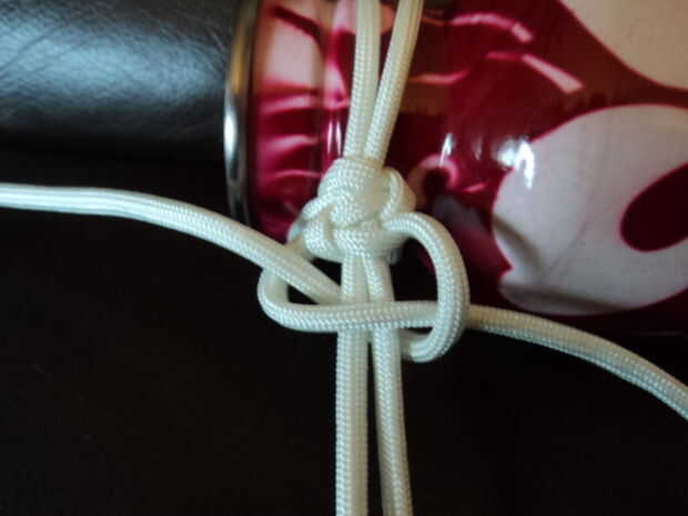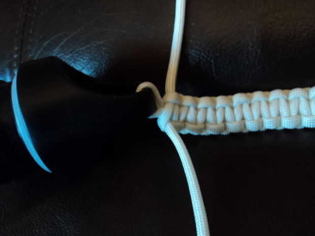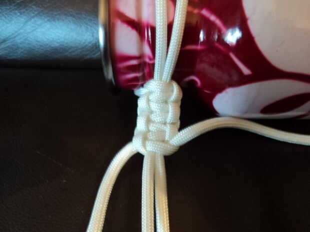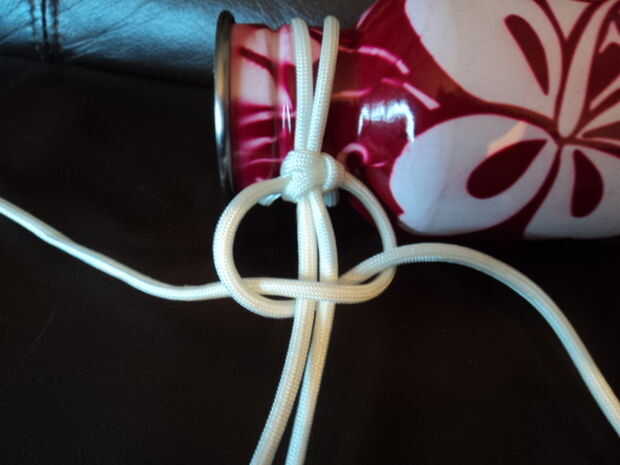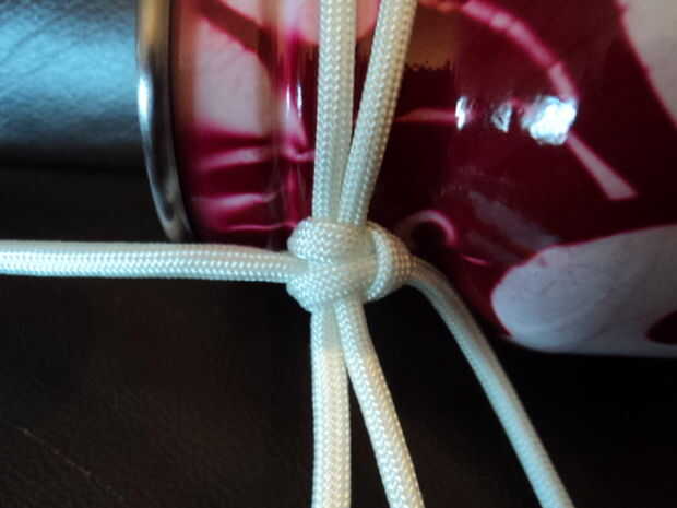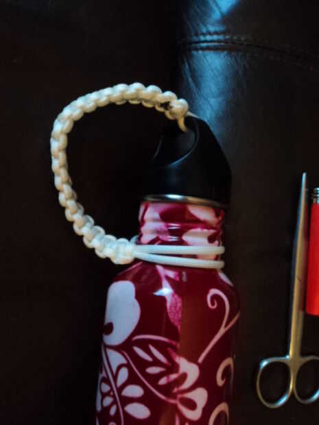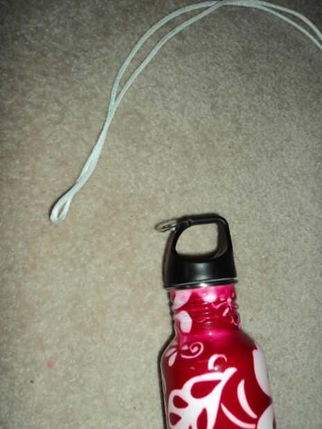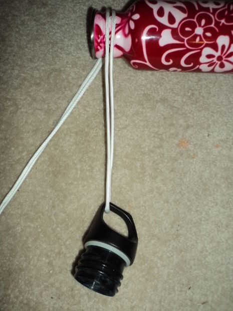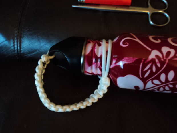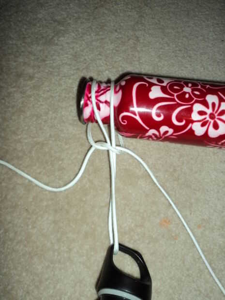 Pone el paracord doblado con la tapa debajo del cuello de botellas; Esto es donde el tamaño de la longitud del lazo unido a la tapa para la longitud correcta. Verifique que la longitud sea suficiente, suficiente para que la correa no está demasiado apretada. Paracord es resbaladizo, por lo que esto podría ser difícil.