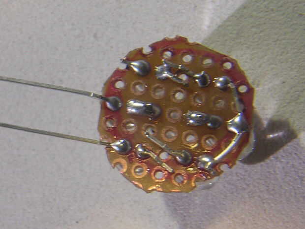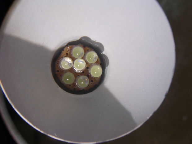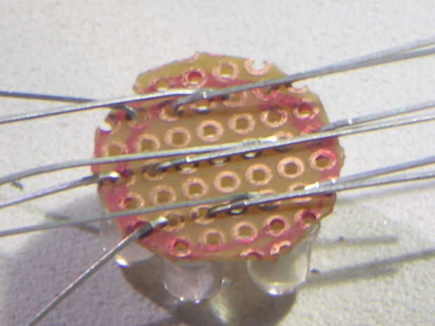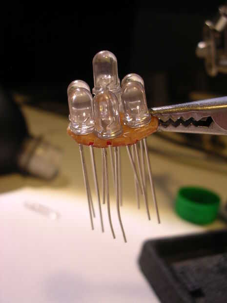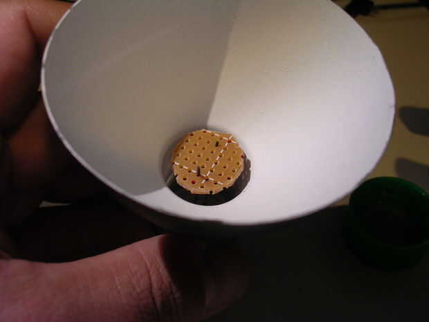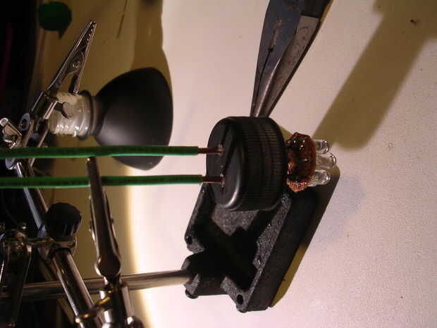 A continuación se conducir el alambre de cobre sólido a través del tapón de la botella y la soldadura en los LEDs. Encendido para asegurarse de que funciona entonces tornillo volver juntos.