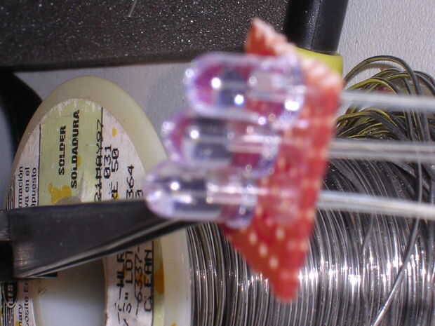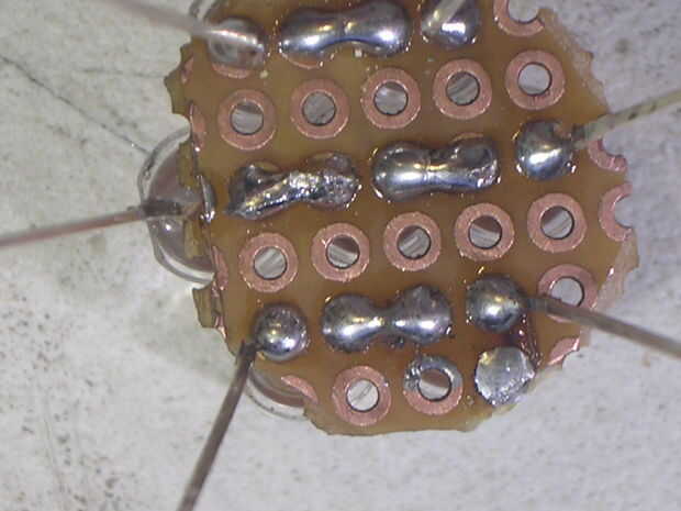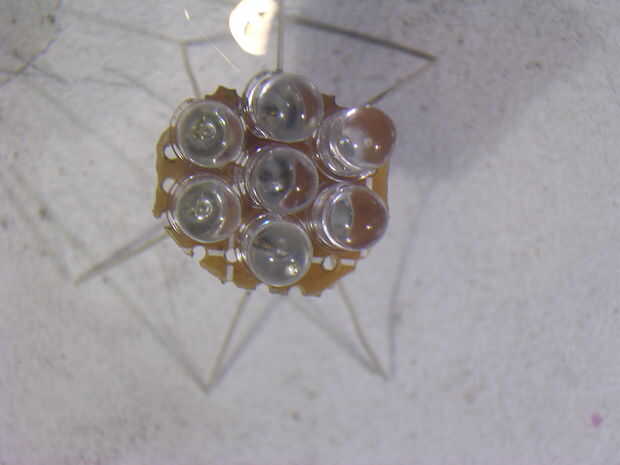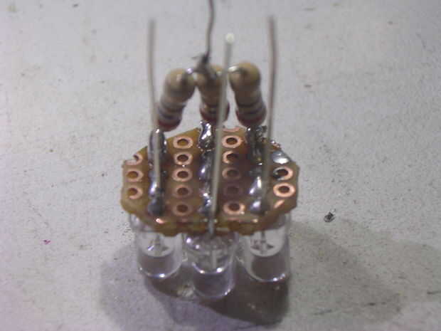 Marcar la placa pref al tamaño que se ajusta el cuello de la botella y corta hacia fuera. Usé un sistema de diques para recortar el círculo. Seleccionar el LED que vaya a utilizar. Extienda en su tabla y les de la soldadura. Utilicé esta página para mis necesidades particulares: http://led.linear1.org/led.wiz le dará el esquema y los arreglos después de que rellene los detalles de su LED.