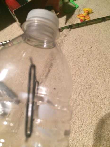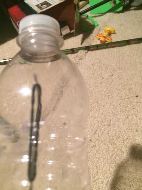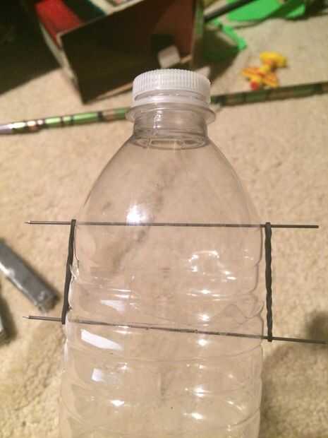 Insertar los palillos utilizan en los agujeros que sólo asomó entonces usted Deslice las bandas de goma a cada lado y deslice el caucho de las bandas la forma Dile que toquen la botella de agua