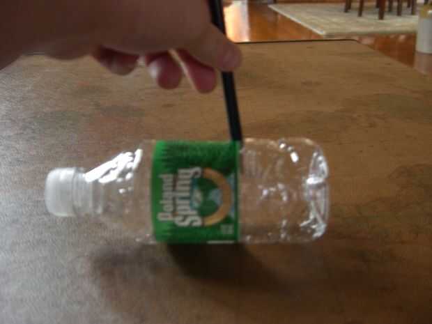 Usando un lado del lápiz, haga un orificio en la primera botella. Con mi botella, he usado donde la etiqueta termina como mi lugar para meter el agujero, pero con botellas de diferentes sus diferentes.