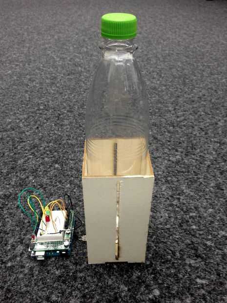 Se trata de un prototipo temprano de una botella de agua que nos ayudará a consumir una cantidad saludable de agua por día. Lo hace por que indica con un LED, si bebió bastante agua. La construcción mide la cantidad de agua en la botella, con un sensor de presión y envía estos datos a un Arduino.