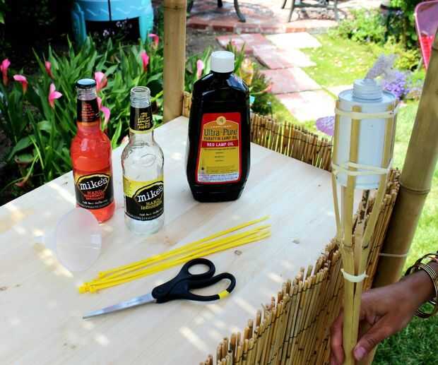 Necesita su botella de cerveza favorita u otra botella, mecha de antorcha tiki, guita del yute, combustible de tiki, una caña de bambú y un encendedor. También puede utilizar como una linterna de mesa y omitir la guita de poste y yute de bambú.