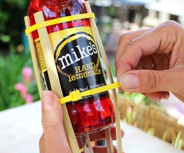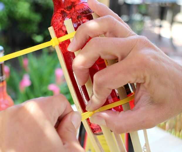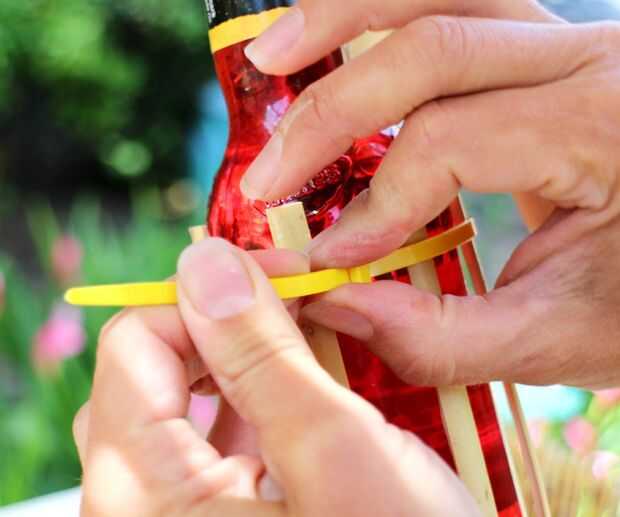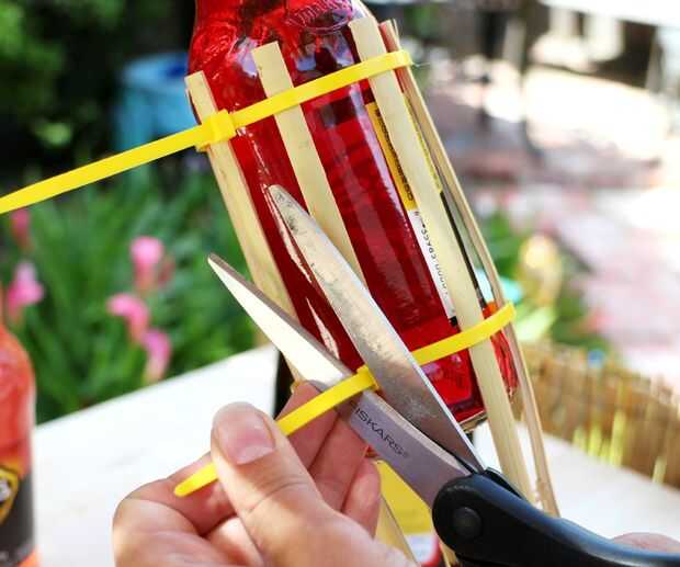 Envuelva una amarra en la parte superior, asegurando la botella firmemente en su lugar. Repita esta más cerca de la parte inferior de la botella. El zip nubby extremos hacia la parte posterior de la botella y recortar las colas.