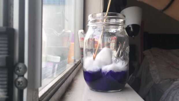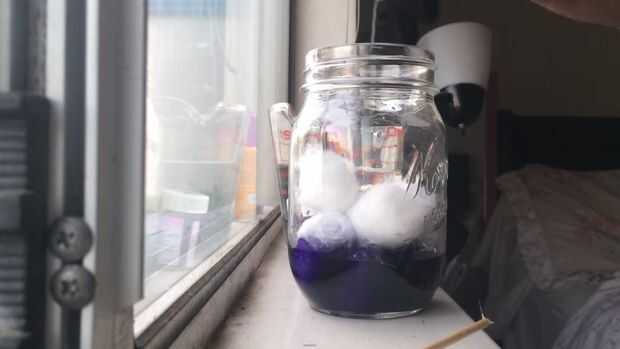 Paso 1: Saludando una botella de vidrio con tapaPaso 2: Un poco de algodonPaso 3: Metes el algodón dentro de la botellaPaso 4: Y aplicas algo de aguaPaso 5: Con tinturas de comida de los colores q quieras (de preferencia azul claro oscuro y rojo)Apli