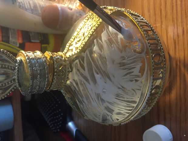 Inicio asegurándose de que la botella es limpiar, limpiar y secar! Poner una cantidad generosa de mod podge en la botella con el cepillo. Entonces a empezar a colocar las joyas en el golpeteo lo que desea.