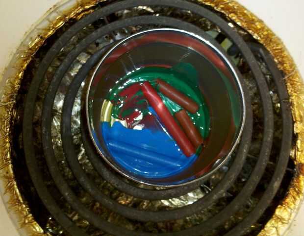 Nota: Crear remolinos de colores, usar contrastantes colores de lápices de colores y agitar suavemente la lata como están derritiendo.
