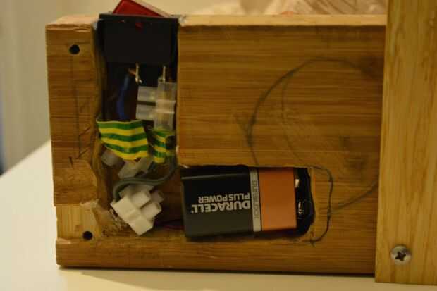 Tome el interruptor y cables. Primero pelar los cables, conectar a la toma de la lámpara. Luego tomar el otro lado del interruptor y tomar algunos filamentos. Tira en ambos lados y Monte el extremo pelado de un conector. Si conectado, conectar los extremos de los cables a la batería y el bloque. Luego pegar todo junto con una pistola de pegamento en el agujero.