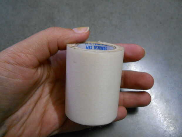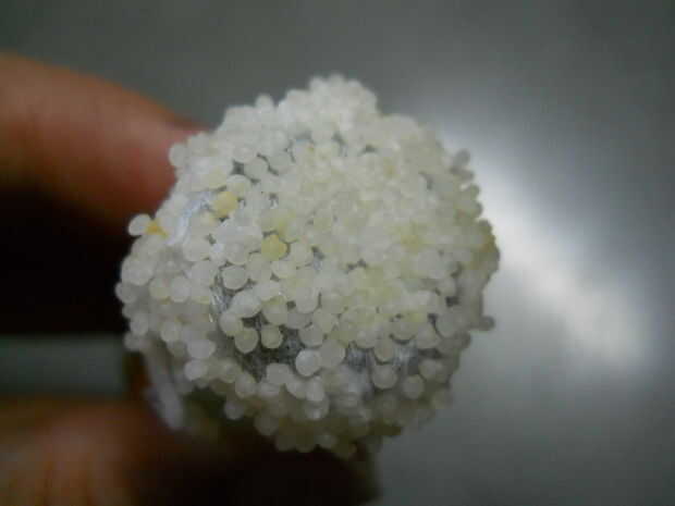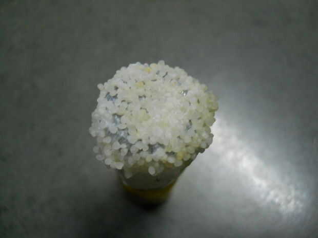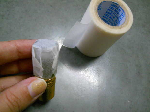 ahora corte un trozo de papel blanco de rollo de papel y ponerlo en la parte inferior de la botella de perfume Aplique el adhesivo blanco (sólo zona inferior) y poner sémola vari del arroz en él. lucen como granos de polen blanco