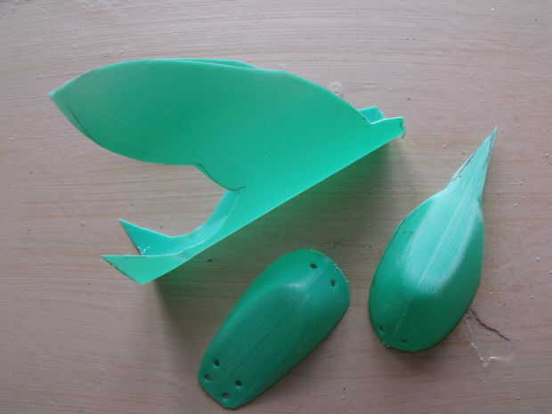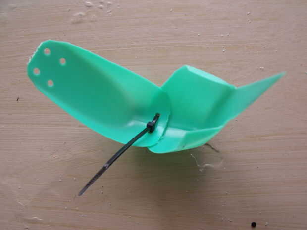 Agujeros en la parte posterior de las cabeza, partes del cuerpo. Tengo un conjunto especial de alicates para esto pero cualquier bodkin sharp va a hacer. Sujete la cabeza y el cuerpo con un cintillo. Asegúrese de comenzar desde el interior para una mirada más limpia. Coloque la parte del cuerpo entre las alas y marque los cuatro orificios correspondiente en partes del cuerpo y el ala.
