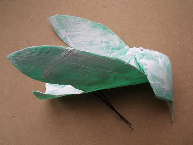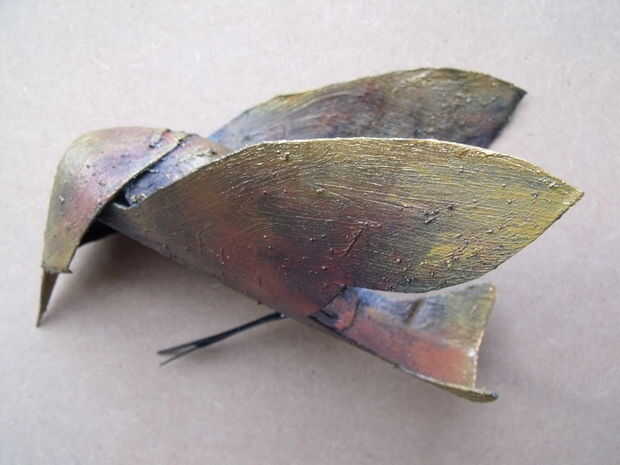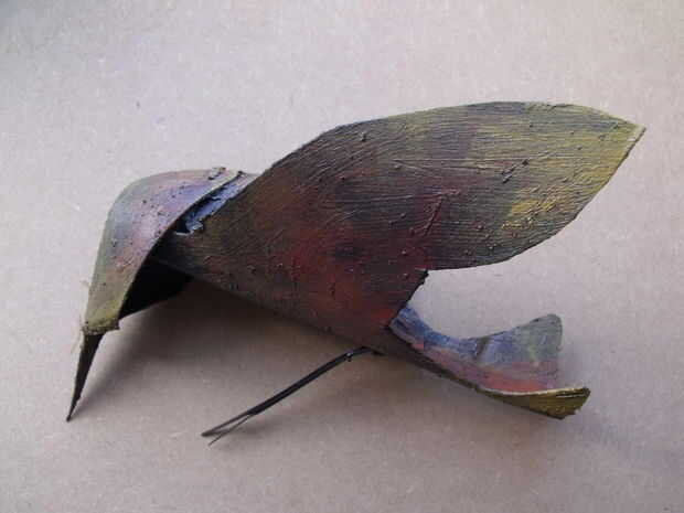 Antes de que se recomienda la pintura un poco de lijado. Luego cubrir el ave con primer o acrílico modelado pasta. Después de secar pintar todo negro y dejar secar nuevamente. Con pinceles casi secos en burnt sienna, cobre y ocres hacen una "niebla" de color sobre la pintura negra. Las arrugas más profundas deben seguir siendo negro. Poner de relieve algunos bordes con pintura de oro, pero no exageres.