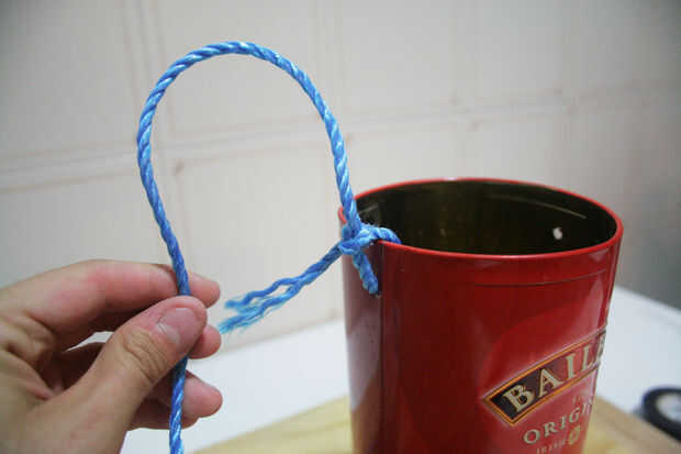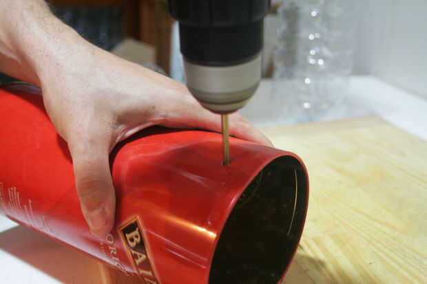 Uso un taladro para abrir dos orificios en la parte superior de la lata, en direcciones opuestas.