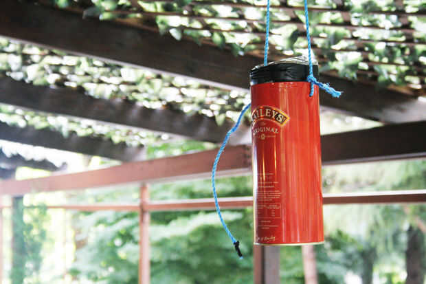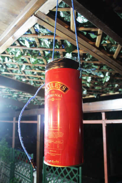 Ahora haga un nudo en el otro agujero de la lata y colgar la trampa fuera!