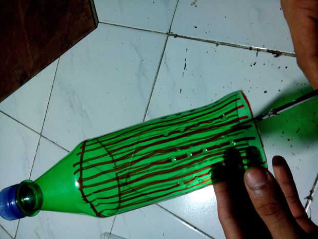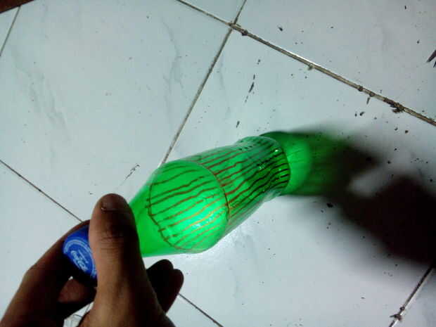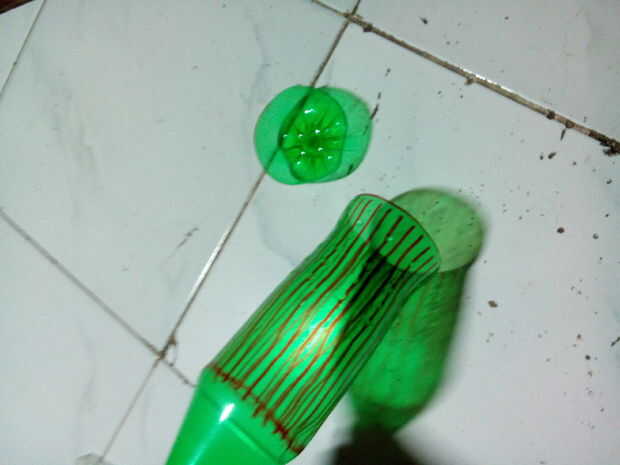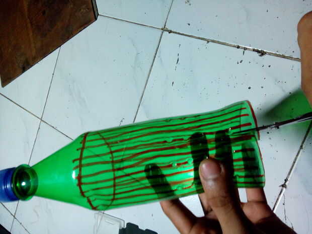 AHORA HACEN MARCA EN LA BOTELLA CON EL MARCADOR Y DESPUÉS HACER QUE CORTA LA PARTE INFERIOR DE LA BOTELLA CON TIJERA.