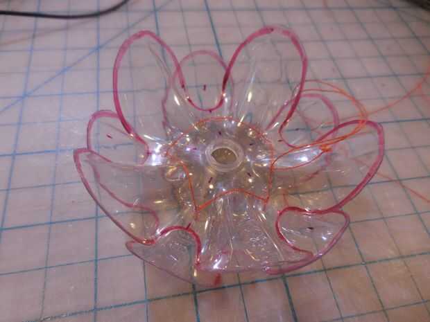 Poner la primera flor en otro fondo de botella. Traza la forma con sharpie. Corte la forma de la flor de la misma manera que el primero. Hacer 8 flores total. Si apila, cada flor debe bloquear mutuamente alternando su posición.