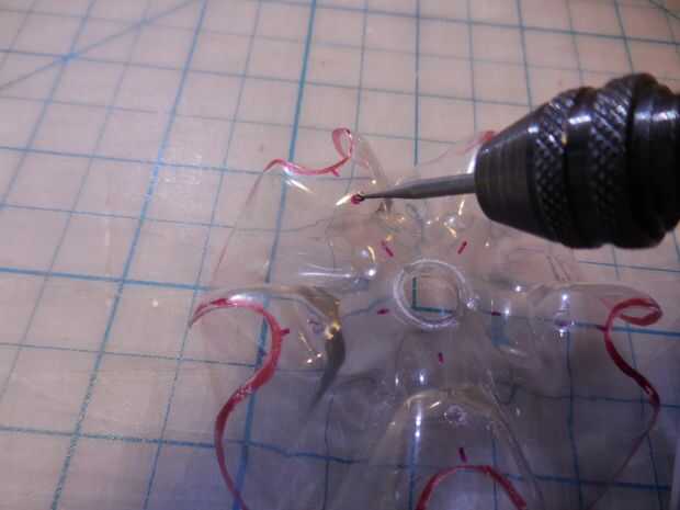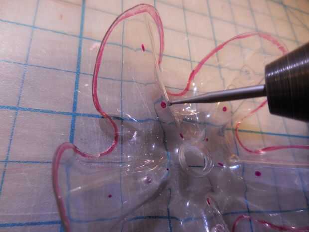 Perfore pequeños agujeros para las patas de alambre con Dremel. Compruebe el tamaño de cada agujero con el cable.