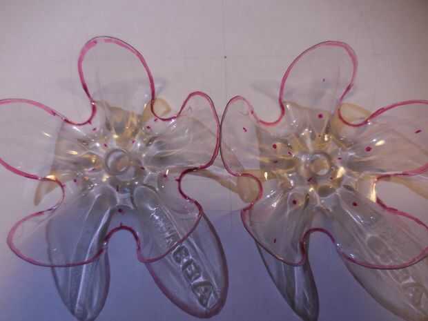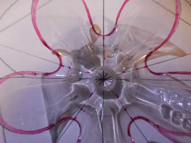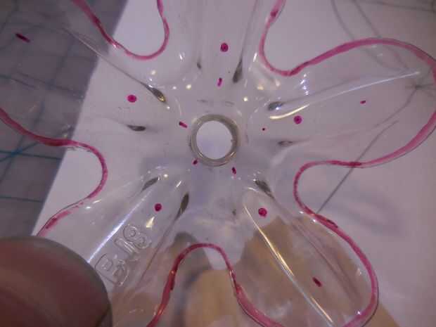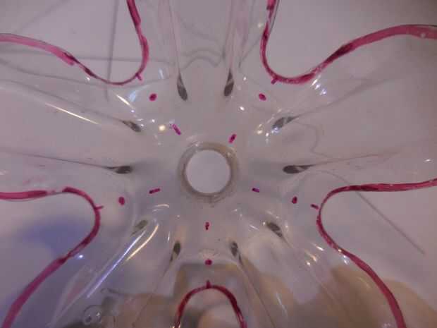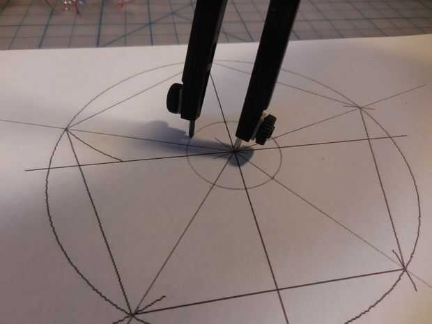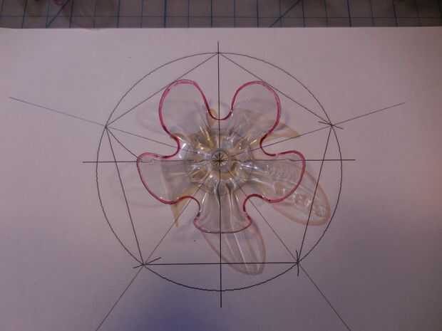Decidir donde quieres poner los 5 cables en la flor. Dibujar un círculo con el compás. Donde se encuentra el círculo con las líneas de radiación serán los agujeros donde van las patas de alambre a través de. Asegúrese de que va alternando la posición de los agujeros. Cuatro flores tendrá los 5 agujeros en el convexo y los otros cuatro tendrán los 5 agujeros en el cóncavo. Coloque cada flor con el Pentágono dibujo y marque los 5 puntos para los agujeros de piernas de alambre.