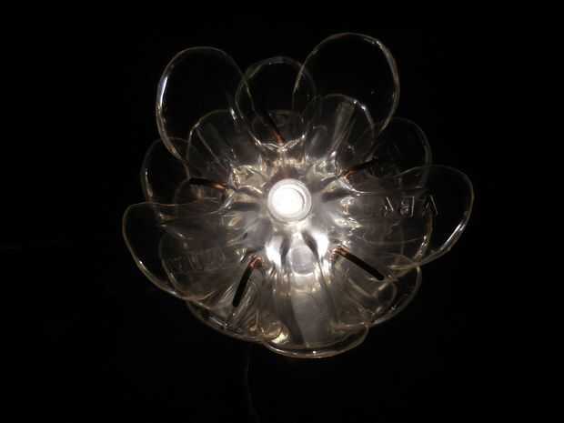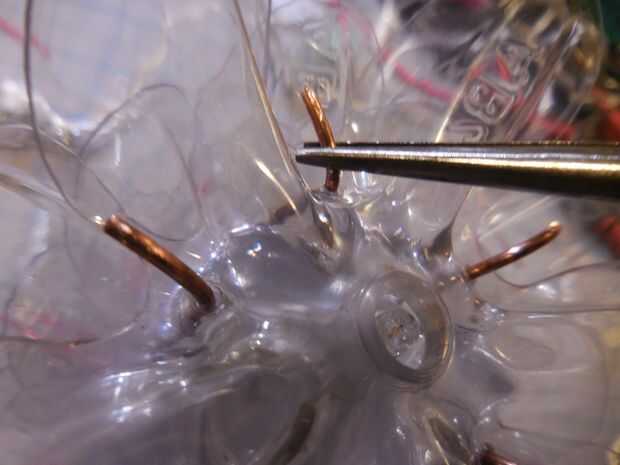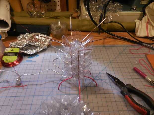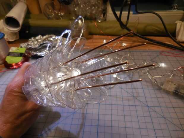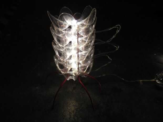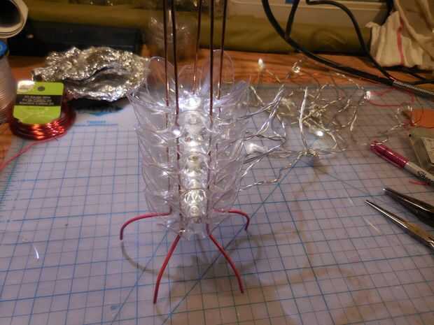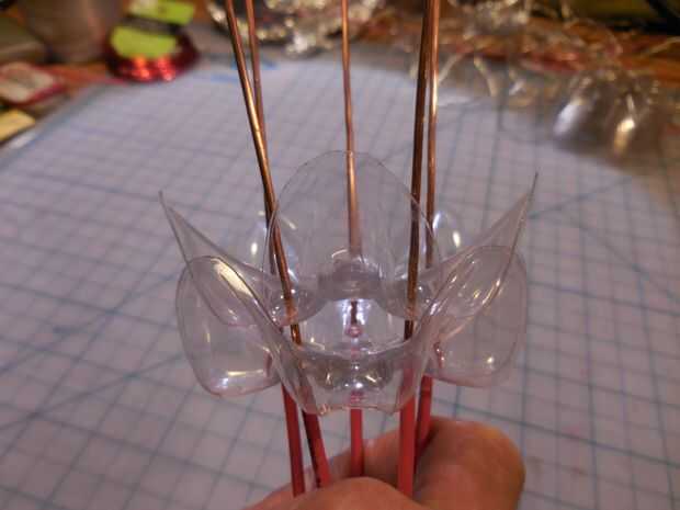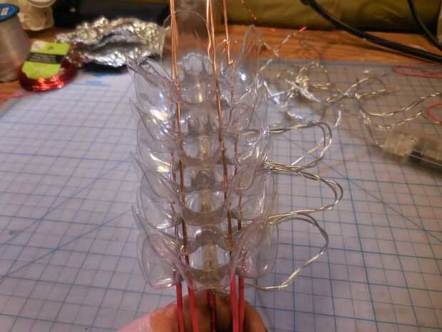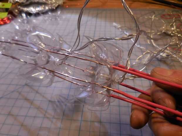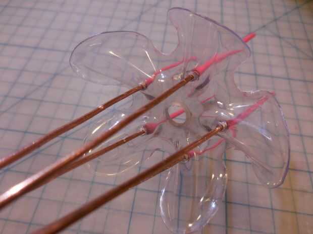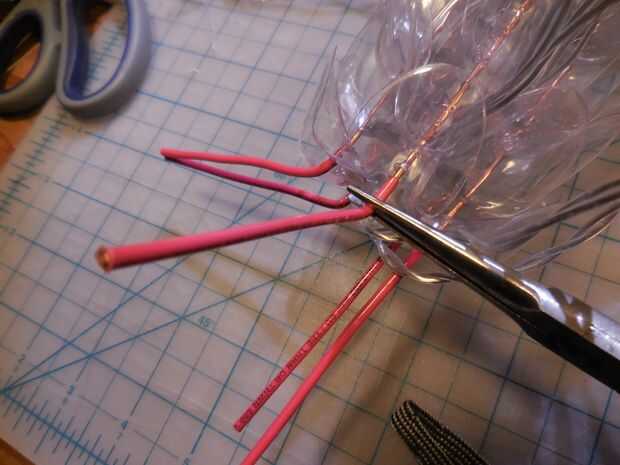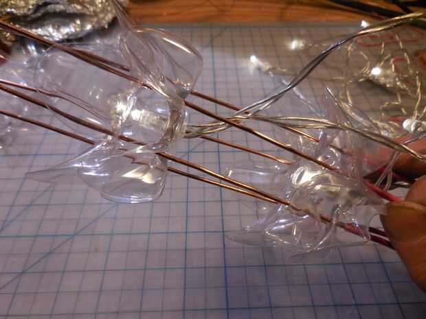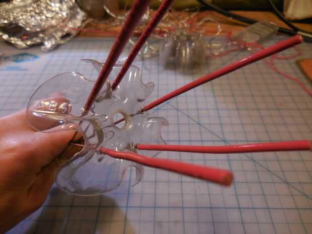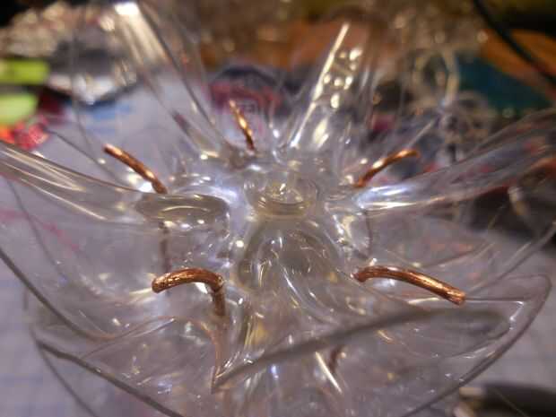 Doblar las piernas de alambre. Instalar las luces LED en los orificios. Presentar los puntos fuertes de los cables con Dremel. Empuje las flores hacia abajo contra las piernas de alambre para cerrar las brechas. Doblar la parte superior de los cables para mantener bajo las flores.