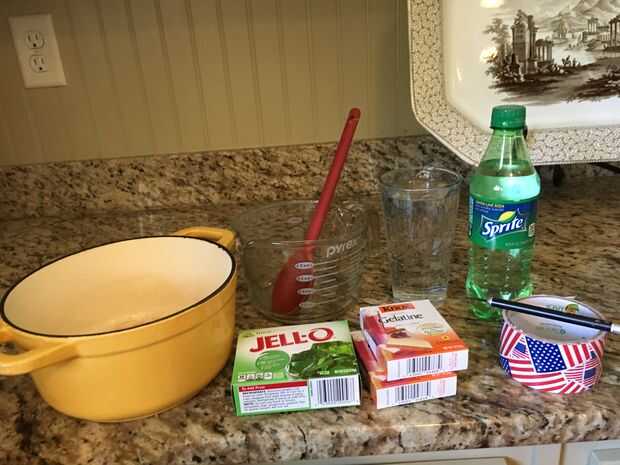 Usted necesitará: una maceta, una cuchara, 8 paquetes de gelatina sin sabor, 6 onzas de cal Jello, conducto de cinta, cuchillo del exacto, botella de 20 onzas de soda de Sprite, un vidrio, tijeras y agua.