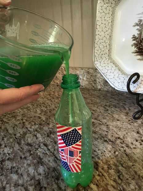 Con cuidado verter la mezcla de gelatina en la botella y asegúrese de llenar en la parte superior. No usamos un embudo pero si tienes uno este sería un buen momento para sacarla. Ahora añadir la tapa y poner la botella en la nevera durante la noche.