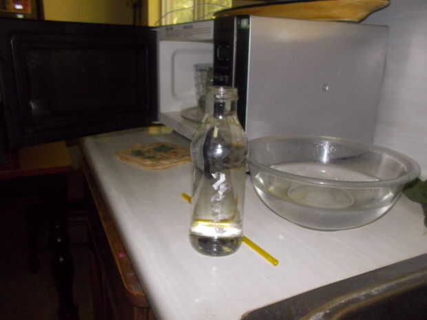 Deje el agua reposar en la botella de vidrio 2-3 minutos para que la botella puede calentar para arriba.