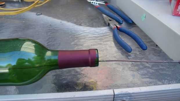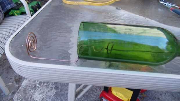 Recordar esa curva de 90 grados 4 pulgadas por encima de la bobina? Lugar que la curva en la parte inferior de la botella con el alambre que se extiende a través del cuello de la botella y hacer un grado 90 doble, básicamente repitiendo lo que se hizo para el interior (esto evita la botella hacia alta) y luego forma un gancho en la parte superior. Lo siento algunas de estas fotos no resultan.