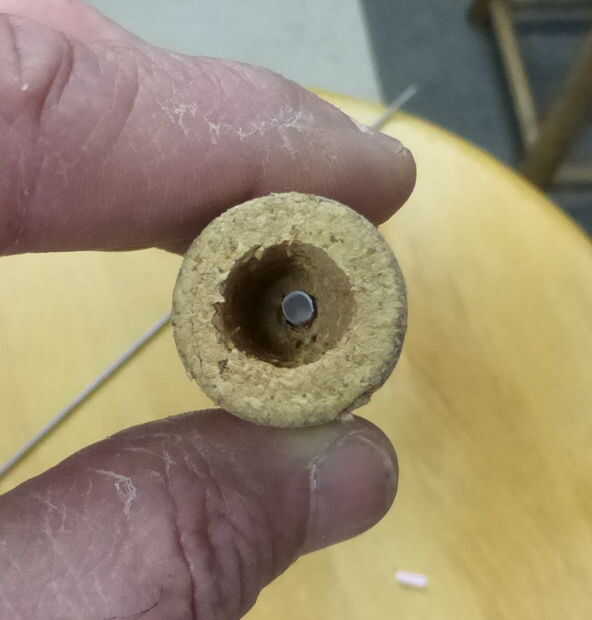 Debido a la dificultad en la perforación de un agujero limpio suave a través del material de corcho tuvimos que instalar una paja larga de 1/4 pulgada para crear un flujo constante y estable de arena.
