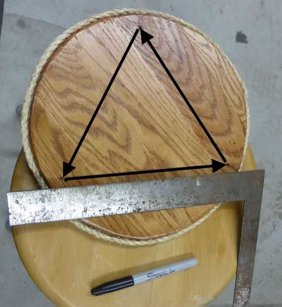 Dibujar un triángulo equilátero en dos placas de extremo con una distancia del borde de ¾ pulgadas desde el borde de las placas y marque estos tres puntos.