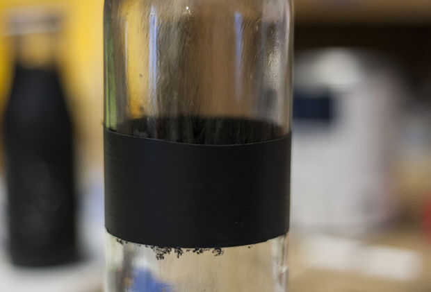 La botella en esta foto se ve nublada porque el M & M fueron agregados a la botella antes de que estuviera totalmente seco. Esto significaba que tenía que lavar la botella más adelante.