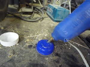 Tapa exterior de ambos párpados con pegamento y unirse a ellos juntos, espalda con espalda. Intentar no tener ningún canal en el pegamento entre las dos superficies que agua podría filtrarse a través de. También intentan minimizar el pegamento en el centro de las tapas donde taladrar el agujero y podría tener contacto con el agua (en caso de que el pegamento es un poco tóxico).