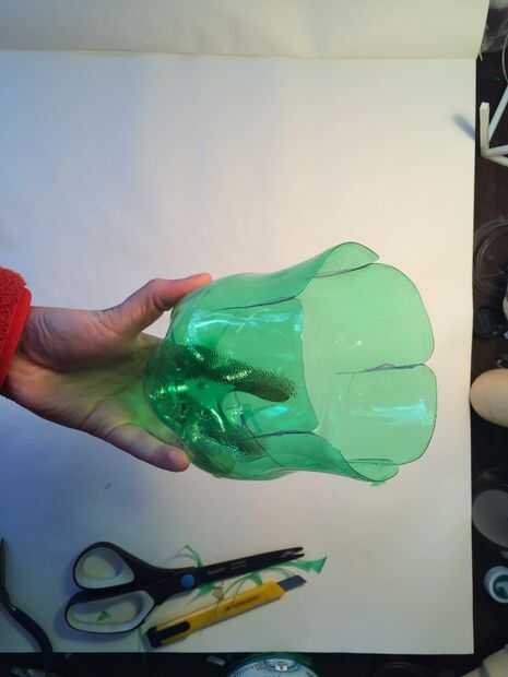 Su botella de refresco debe tener cinco protuberancias en la botella, para aprovechar al máximo su estabilidad al estar de pie. Haga una marca entre cada uno de estos golpes, indicando donde se harán los cortes verticales. Usando tijeras, haga cortes verticales hacia abajo hacia la base de la botella, dejar aproximadamente __inches del fondo.