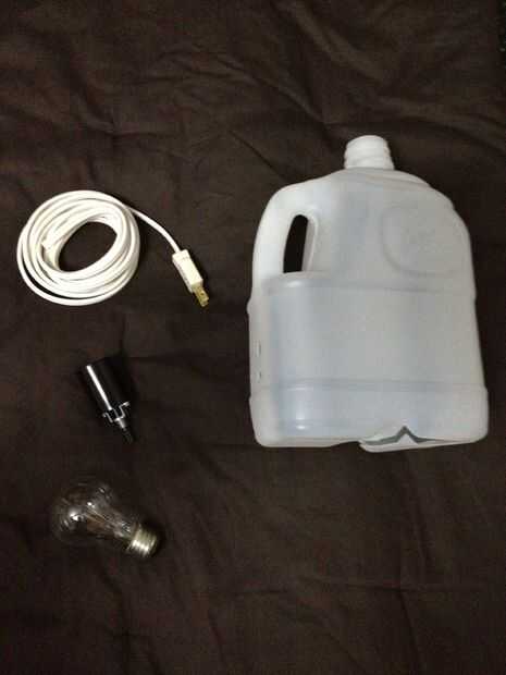 Debemos comprar los siguientes materiales: 1. - dos una de tres metros cable para lámpara 2. - un enchufe 3. - un zoquet con interruptor integrado 4. - un foco o lámpara ahorradora Usar una botella de plástico usada, lo suficientemente grande para quepa el foco