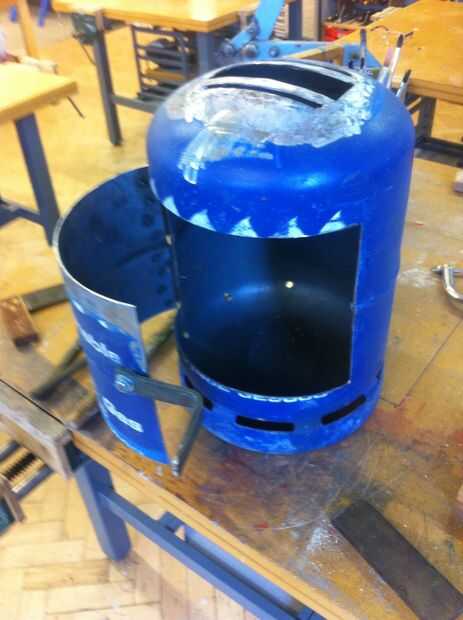 Re instale la puerta y compruebe sus bisagras trabajan. Quería añadir una placa en la parte superior del quemador, pero no tenía ninguna placa de acero gruesa así que usa unos cortes des, estas había marcado y corte los orificios en la parte superior de la botella.